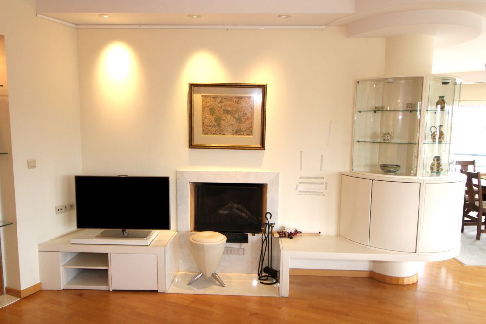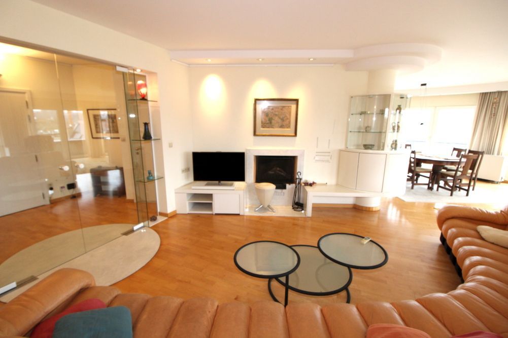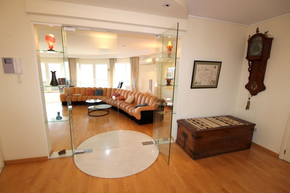 Via een ruime inkomhal met videophone, bezoekerstoilet en vestiaire, kom je in de majestueuze woonkamer (68 m2) met een zithoek met open haard (23 m2) en een ruim eetgedeelte (45 m2). Vanaf de drie belendende balkons heb je een prachtig zicht over het nabije Leie park. Dankzij de twaalf panoramaramen van de woonruimte heb je veel lichtval. De bevloering bestaat uit beukparket. Het plafond is voorzien van spotverlichting.
