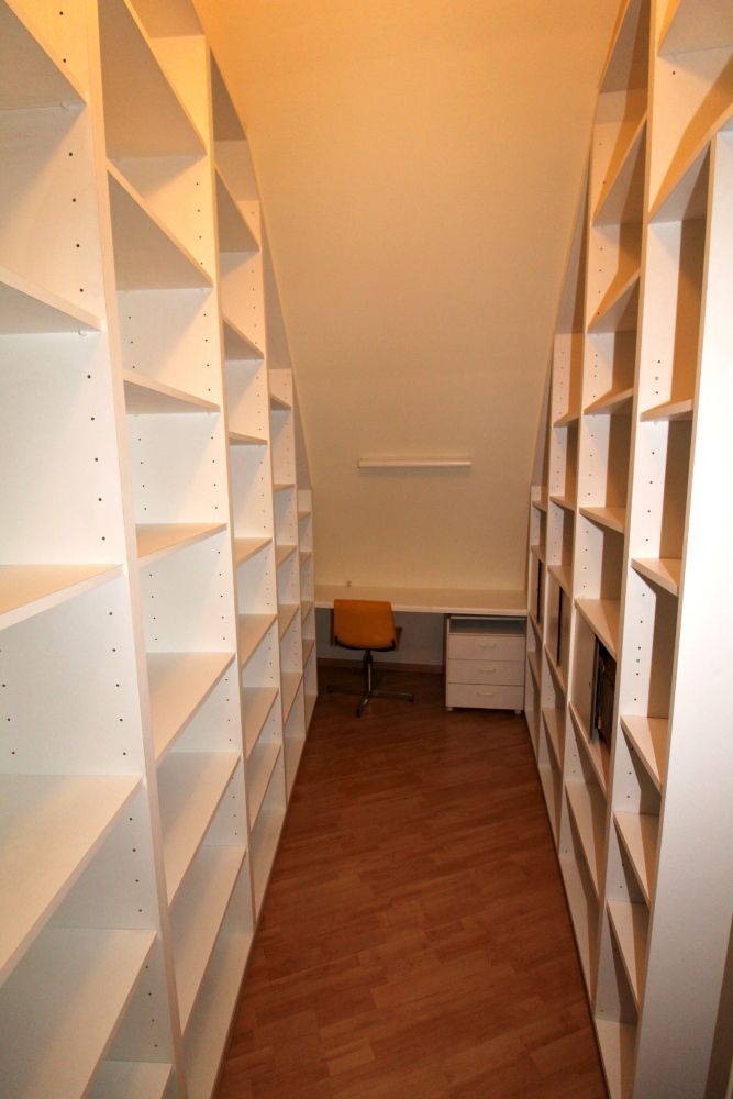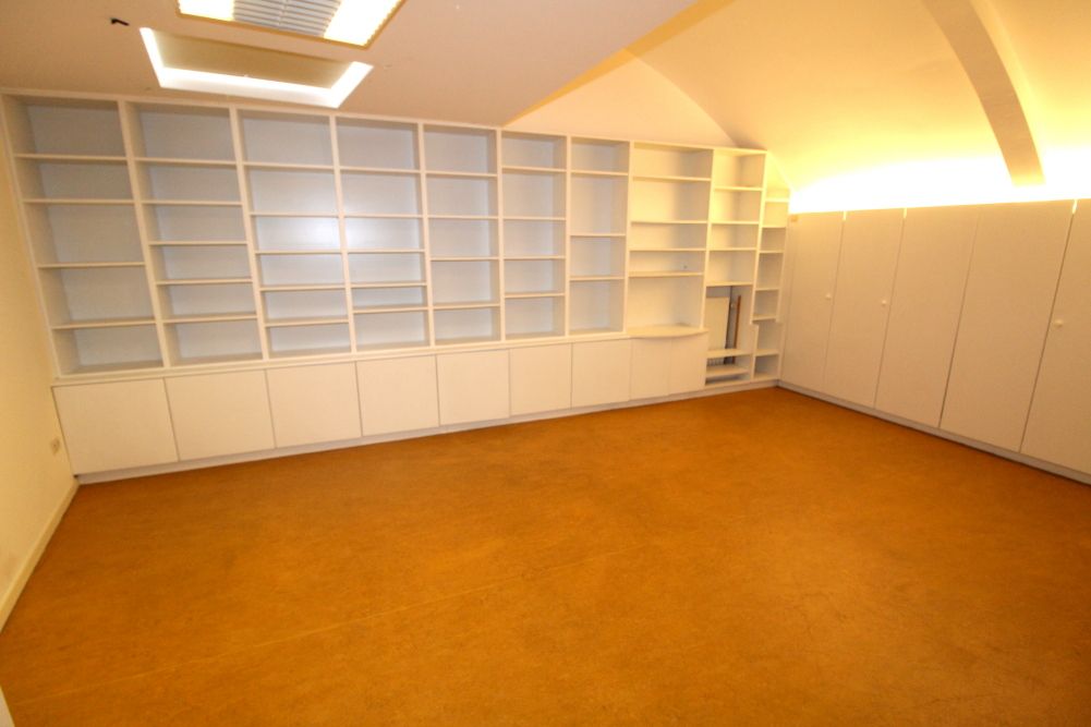 Links van de inkom, bevindt zich een bezoekerstoilet, een volledig ingerichte keuken (15 m2), (met koelkast en diepvriezer, elektrisch fornuis met vier kookplaten, microgolf, oven, afwasmachine en dampkap). Hier bevindt zich ook een grote bureauruimte (23 m2) met wandkasten tot aan het plafond. Tenslotte is er een grote bergruimte (33 m2) met ingebouwde kasten en daglicht via twee lichtkoepels in het plafond.